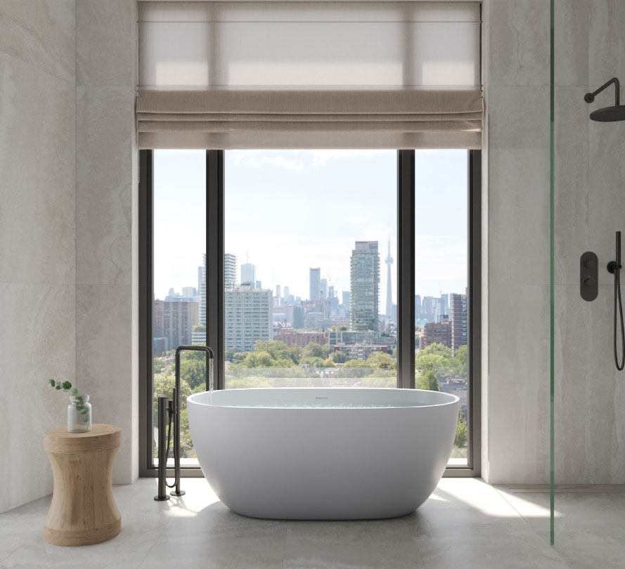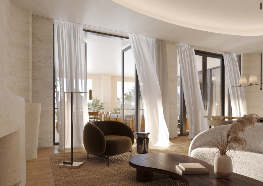 Private balconies and terraces with glass railings.